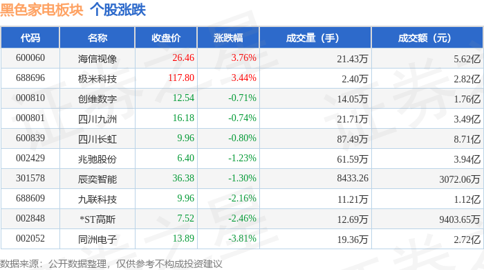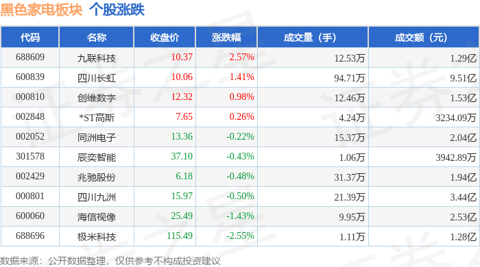 从资金流向上来看,当日黑色家电板块主力资金净流出867.45万元,游资资金净流出5653.11万元,散户 资金净流入6520.56万元。黑色家电板块个股资金流向见下表: | 代码 | 名称 | 主力净流入(元) | 主力净占比 游资净流入 (元) | | 游资净占比 散户净流入(元) | | 散户净占比 | | --- | --- | --- | --- | --- | --- | --- | --- | | 600839 四川长虹 | | 9205.75万 | 9.68% | -3968.09万 | -4.17% | -5237.66万 | -5.50% | | 301578 辰奕智能 | | -31.71万 | -0.80% | 68.60万 | 1.74% | -36.89万 | -0.94% | | 688609 | 九联科技 | -37.80万 | -0.29% | -357.23万 | -2.77% | - 395.02万 | 3.06% | | 688696 极米科技 | | -62.86万 | -0.49% | -1960.01万 | -15.32% | 2022.87万 | 15.81% | ...