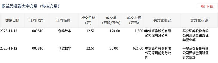11月12日,创维数字大宗交易成交170万股,成交额2125万元,占当日总成交额的10.77%,成交价12.5 元,较市场收盘价12.54元折价0.32%。 | 交易日期 | 证券代码 | 证券简称 | 成交价格 | 成交量 | 成交金额 买方营业部 | 卖方营业部 | | --- | --- | --- | --- | --- | --- | --- | | | | | (元) | (万股/万份) | (万元) | | | 2025-11-12 | 000810 | 创维数字 | 12.50 | 120.00 | 1,500.00信证券股份有限 | 平安证券股份有限 | | | | | | | 公司深圳分公司 | 公司深圳金田路证 | | | | | | | | 劳营业部 | | 2025-11-12 | 000810 | 创维数字 | 12.50 | 50.00 | 625.00 中信证券股份有限 | 平安证券股份有限 | | | | | | | 公司深圳前海分公 | 公司深圳金田路证 | | | | | | | 교 | 券营业部 | ...