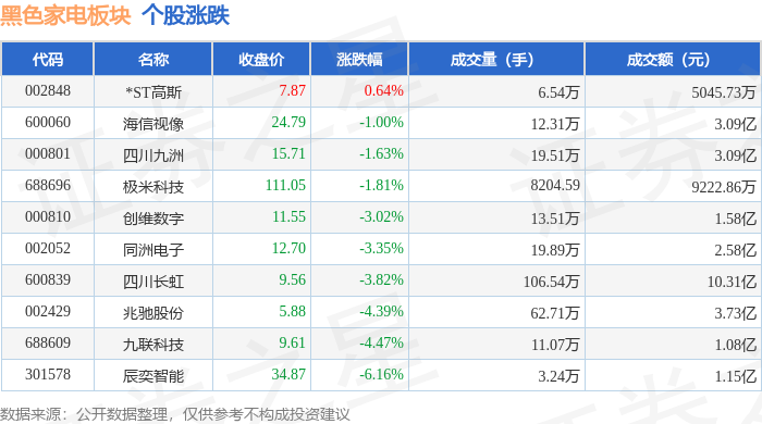Market Overview - The black home appliance sector rose by 0.11% compared to the previous trading day, with Chenyi Intelligent leading the gains [1] - The Shanghai Composite Index closed at 3931.05, down 0.4%, while the Shenzhen Component Index closed at 12980.82, down 0.76% [1] Stock Performance - Key stocks in the black home appliance sector showed varied performance, with Chenyi Intelligent closing at 37.16, up 2.31%, and Hisense Visual at 25.04, up 1.46% [1] - Other notable performances include Jiulian Technology at 10.06, up 0.60%, and ST Gauss at 7.82, up 0.51% [1] - Conversely, XGIMI Technology saw a decline of 2.30%, closing at 113.10 [1] Capital Flow - The black home appliance sector experienced a net outflow of 39.21 million yuan from institutional investors, while retail investors saw a net inflow of 39.92 million yuan [1] - Detailed capital flow data indicates that Chenyi Intelligent had a net inflow of 8.34 million yuan from institutional investors, while retail investors had a net outflow of 19.46 million yuan [2] - Other stocks like Sichuan Changhong and Creative Digital also faced significant net outflows from institutional investors, amounting to 22.26 million yuan and 21.99 million yuan respectively [2]