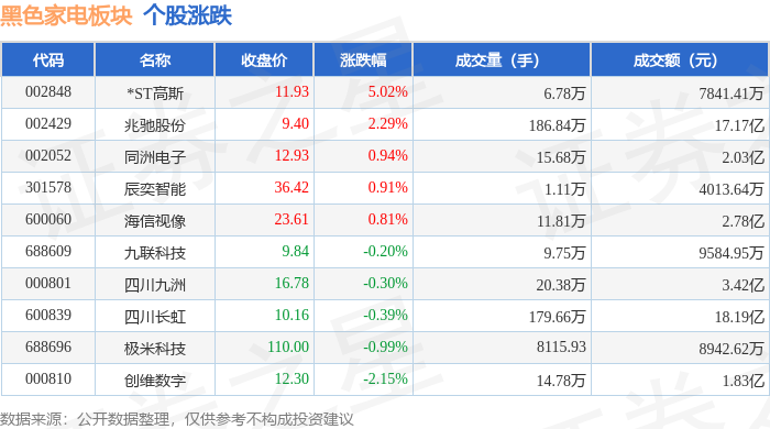 证券之星消息,1月12日黑色家电板块较上一交易日上涨5.52%,四川长虹领涨。当日上证指数报收于 4165.29,上涨1.09%。深证成指报收于14366.91,上涨1.75%。黑色家电板块个股涨跌见下表: | 代码 | 名称 | 收盘价 | 涨跌幅 | 成交量(手) | 成交额(元) | | --- | --- | --- | --- | --- | --- | | 600839 | 四川长虹 | 10.38 | 9.96% | 401.53万 | 39.98 Z | | 002429 | 兆驰股份 | 8.31 | 7.23% | 246.66万 | 19.80 Z | | 002848 | *ST高斯 | 10.78 | 4.97% | ● 3.63万 | 3887.82万 | | 600060 | 海信视像 | 25.35 | 4.32% | 30.02万 | 7.65亿 | | 000801 | 四川九洲 | 18.51 | 3.70% | 52.92万 | 9.69 G | | 000810 | 创维数字 | 12.92 | 3.28% | 30.71万 | 3.93亿 | | 301578 | ...