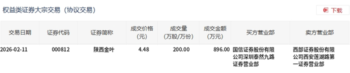 | 权益类证券大宗交易(协议交易) | | | | | | | 团 下载 | | --- | --- | --- | --- | --- | --- | --- | --- | | 交易日期 | 证券代码 | 证券简称 | 成交价格 | 成交量 | 成交金额 | 买方营业部 | 卖方营业部 | | | | | (元) | (万股/万份) | (万元) | | | | 2026-02-11 | 000812 | 陕西金叶 | 4.48 | 200.00 | | 896.00 国信证券股份有限 | 西部证券股份有限 | | | | | | | | 公司深圳泰然九路 | 公司西安连湖路第 | | | | | | | | 证券营业部 | 一证券营不部 | 2月11日,陕西金叶大宗交易成交200万股,成交额896万元,占当日总成交额的17.64%,成交价4.48 元,较市场收盘价4.48元持平。 ...