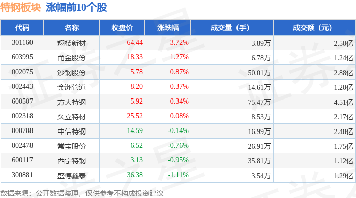 证券之星消息,10月29日特钢板块较上一交易日上涨0.37%,太钢不锈领涨。当日上证指数报收于 4016.33,上涨0.7%。深证成指报收于13691.38,上涨1.95%。特钢板块个股涨跌见下表: | 代码 | 名称 | 收盘价 | 涨跌幅 | 成交量(手) | 成交额(元) | | | --- | --- | --- | --- | --- | --- | --- | | 000825 | 太钢不锈 | 4.22 | 3.43% | 70.49万 | | 2.94亿 | | 301160 | 翔楼新材 | 63.66 | 1.45% | 2.31万 | | 1.46亿 | | 600507 | 方大特钢 | 5.54 | 1.09% | 21.47万 | | 1.17亿 | | 600399 | 抚顺特钢 | 5.28 | 0.38% | 25.83万 | | 1.35亿 | | 002075 | 沙钢股份 | 5.62 | 0.36% | 27.21万 | | 1.51亿 | | 002318 | 久立特材 | 25.51 | 0.04% | 12.18万 | | 3.10亿 | | 600117 |  ...