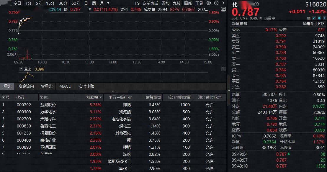 成份股方面,钾肥、聚氨酯、锂电等板块部分个股涨幅居前。截至发稿,盐湖股份飙涨超5%,万华化学大涨超3%,天赐材料、鲁西化工、藏格矿业等多股 跟涨超2%。 | | | 多日 1分 5分 15分 30分 60分 | | 日 周月 = | | | F9 盘前盘后 喬加 九转 画线 下具 © 2 > | | 16 D | | 51602 | | --- | --- | --- | --- | --- | --- | --- | --- | --- | --- | --- | --- | | 0.790 | | | 09:49 6 0.787 | | | ₹ 0.011(1.42%) 均价 0.786 成交量 2894 IOPV 0.7862 202 ... | | We 1.80% | 0 7 37 | | +0.011 +1.429 | | 0.783 | | | | | | | | 0.9096 | SSE CNY 9:49:10 交易中 | | 一 。 | | | | | | | | | | | 净值走势 | | 华宝化工ETF | | 0.776 | | | | | | | | 0.00% | 委比 | 0. ...
