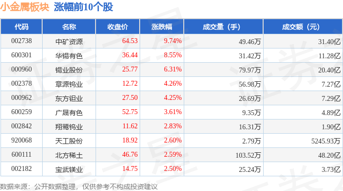 从资金流向上来看,当日小金属板块主力资金净流入9.91亿元,游资资金净流出2.81亿元,散户资金净流 出7.1亿元。小金属板块个股资金流向见下表: | 代码 | 名称 | 收盘价 | 涨跌幅 | 成交量(手) | 成交额(元) | | --- | --- | --- | --- | --- | --- | | 000657 | 中钨高新 | 22.56 | -0.88% | 117.27万 | 26.74亿 | | 688750 | 金天钛业 | 20.64 | 0.00% | 2.70万 | 5585.44万 | | 002149 | 西部材料 | 17.41 | 0.64% | 11.50万 | 2.00亿 | | 002978 | 安宁股份 | 33.34 | 1.12% | 8.18万 | 2.74亿 | | 301026 | 浩通科技 | 26.78 | 1.13% | 4.10万 | 1.10亿 | | 600456 | 宝钛股份 | 32.73 | 1.43% | 9.52万 | 3.11亿 | | 600459 | 盖研铂业 | 17.40 | 1.52% | 29.73万 | 5.19亿 | ...