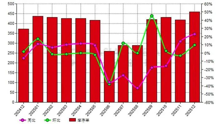 Core Insights - The inventory rate of China's rare earth separation plants reached 459.03% in December, an increase from 372.31% year-on-year and 418.58% month-on-month, reflecting a year-on-year increase of 23.29% and a month-on-month increase of 9.66% [6][7][11] Group 1: Inventory Rates - The average inventory rate for China's rare earth separation plants from January to December 2025 was 391.87%, down 6.00% from 417.48% in the same period last year [7] - The inventory rate for operational rare earth separation plants in December was 437.97%, showing a year-on-year increase of 20.24% and a month-on-month increase of 9.81% [7][11] Group 2: Provincial Inventory Rates - The provinces with the highest inventory rates in December were Jiangxi, Sichuan, and Jiangsu, with Jiangxi at 869.05%, Sichuan at 468.53%, and Jiangsu at 272.22% [5][11] - Jiangxi's inventory rate remained unchanged from the previous month but increased from 797.28% year-on-year, while Sichuan's inventory rate rose significantly from 173.81% year-on-year [5][11]