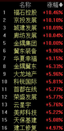 早盘京津冀概念集体高开,截止发稿福石控股、京投发展、城建发展、廊坊发展、金隅集团、冀东装备 涨停,华夏幸福涨超9%,金隅冀东涨超6%,大龙地产、科锐国际、首都在线、荣盛发展等涨超5%。 相关行业: 交通基建:京津冀规划明确要打造"八廊两环"交通廊道,建成面向世界的国际性综合交通枢纽集群,京 唐城际等新线贯通进一步织密区域交通网络。从事轨道交通建设、公路工程施工、港口运营的企业将迎 来订单规模持续增长,深度分享区域交通一体化的发展红利。 产业协同创新:规划提出构建"两廊四带"产业协同创新格局,因地制宜发展新质生产力,推动先进制造 业集群加速成型。承接京津产业转移的园区运营企业、具备高端制造能力的实体企业将获得政策倾斜与 资源支持,借助产业协同实现业务规模快速扩张。 | | 名称 | 涨幅4 | | --- | --- | --- | | 1 | 福石控股 | +10.46% | | 2 | 京投发展 | +10.10% | | 3 | 城建发展 | +10.09% | | 4 | 廊坊发展 | +10.04% | | 5 | 金隅集团 | +10.00% | | 6 | 冀东装备 | +9.96% | | 7 ...