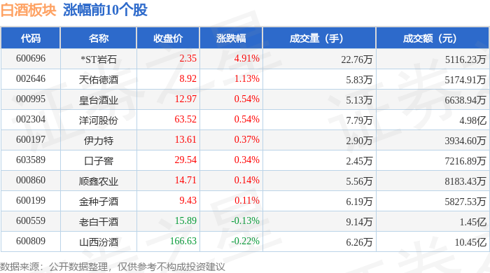 | 代码 | 名称 | 收盘价 | 涨跌幅 | 成交量(手) | 成交额(元) | | --- | --- | --- | --- | --- | --- | | 000596 | 古井贡酒 | 127.03 | -1.22% | 3.32万 | 4.25 Z | | 603369 | 今世缘 | 33.91 | -0.91% | 7.36万 | 2.51亿 | | 615009 | 贵州茅台 | 1340.06 | -0.81% | 5.90万 | 79.62亿 | | 000568 | 泸州老窖 | 112.35 | -0.73% | 8.24万 | 9.30亿 | | 616809 | 金徽酒 | 19.87 | -0.50% | 3.57万 | 7121.10万 | | 600779 | 水井坊 | 38.75 | -0.46% | 3.75万 | 1.45亿 | | 600702 | 舍得酒业 | 54.44 | -0.33% | 4.65万 | 2.53亿 | | 603198 | 迎驾贡酒 | 38.84 | -0.31% | 3.33万 | 1.29亿 | | 000858 | 五粮液 | 1 ...