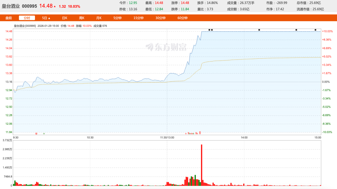 文|酒讯 方圆 编辑|念祎 离春节还有18天,白酒板块提前过年。 1月29日,白酒股迎来了一场久违的集体大涨。截至收盘,A股20只白酒股中18只个股录得涨停,白酒板块总市值单日增超2526亿,仅贵州茅台一家市值 增长超过1400亿元。 一场罕见的集体大涨,不禁让人好奇:白酒股到底发生了什么? 01、白酒股狂飙 "逆袭"是2026年1月29日白酒板块的注脚。 当日开盘,白酒股走的是"常规"路线。上午开盘,贵州茅台、五粮液、山西汾酒、泸州老窖、古井贡酒等头部酒企几乎平开,而金种子酒、皇台酒业、酒 鬼酒等更多的二三线酒企股价则大面积低开,ST*岩石更是开盘跌停。 站在开盘时间点,这景象与白酒板块过去平淡如水的日常并无二致。 随着时间推移,白酒板块的故事走向开始打破常规。复盘个股当日走势可以看到,20只白酒股无一例外走出"爬坡"曲线。1月29日13点26分,皇台酒业与 ST*岩石率先行至涨停板,后者更是走出"地天板"行情;酒鬼酒、金徽酒、舍得酒业等个股紧随其后纷纷迎来首板涨停;洋河股份则在14点55分作为第18 只涨停白酒股压轴出场,为当日白酒板块的集体狂飙画上圆满句号。 图片来源:东方财富网 除此之外,贵州茅台与顺 ...