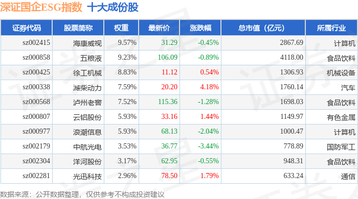 | 证券代码 | 股票简称 | 权重 | 最新价 | 涨跌幅 | 总市值(亿元) | | 所属行业 | | --- | --- | --- | --- | --- | --- | --- | --- | | sz002415 | 海康威视 | 9.57% | 31.29 | -0.45% | | 2867.69 | 计算机 | | sz000858 | 五粮液 | 9.23% | 106.09 | -0.89% | | 4118.00 | 食品饮料 | | sz000425 | 徐工机械 | 8.83% | 11.12 | 0.54% | 4. V | 1306.93 | 机械设备 | | sz000338 | 潍柴动力 | 7.59% | 20.20 | 4.18% | S | 1760.14 | 汽车 | | sz000568 | 泸州老窖 | 7.52% | 115.36 | -1.28% | | 1698.03 | 食品饮料 | | sz000807 | 云铝股份 | 5.93% | 33.16 | 1.44% | | 1149.97 | 有色金属 | | sz000977 | 浪潮信息 | 5.93 ...
