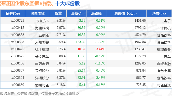 | 证券代码 | 股票简称 | 权重 | 最新价 | 涨跌幅 | 总市值(亿元) | | 所属行业 | | --- | --- | --- | --- | --- | --- | --- | --- | | sh600887 | 伊利股份 | 10.26% | 29.43 | 0.17% | | 1861.55 | ■ 食品饮料 | | sh600519 | 贵州茅台 | 9.82% | 1448.00 | -0.17% | | 18132.87 | 食品饮料 | | sz000858 | 五粮液 | 9.49% | 117.65 | -0.17% | 4 7 | 4566.71 | 食品饮料 | | sz002714 | 牧原股份 | 9.18% | 49.70 | -2.07% | | 2715.00 | 农林牧渔 | | sz000568 | 泸州老窖 | 6.62% | 135.76 | -0.09% | | 1998.31 | 食品饮料 | | sz300498 | 温氏股份 | 6.37% | 17.54 | -2.99% | | 1167.10 | 农林牧渔 | | sh600809 | 山西汾 ...