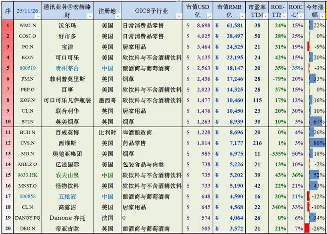 来源:市场资讯 (来源:宏赫臻财) ↑宏赫原创研究,投资实战思考↑ 宏赫按:根据GICS全球分类体系,一级行业(或称为行业部门)共有11个,本推文不定期为大家跟踪 这11个行业部门旗下的中美上市公司市值Top20。为投资者跟踪和投资龙头公司提供利器。 今天来统计「日常消费品」行业部门的公司,截止当前数据日,该行业部门美股共有211只证券标的; 中股共有496只证券标的(A股309港股187只,AH+7只)。 中美GICS「日常消费品」行业 上市公司市值Top20 GICS四级子行业最多是软饮料与不含酒精互动媒体与娱乐,有5家公司。 其他关注: 1、沃尔玛:8698亿美元(合6.16万亿人民币) 2、好市多:4025亿美元(合2.85万亿人民币) 3、保洁:3464亿美元(合2.45万亿人民币) 贵州茅台当前市值2563亿美元,位列第5位(上期第--),20强中中国公司有3家上榜。 本期该行业20强盈利能力↓ 投入资本回报率(ROIC)中位数为17%;平均值19%。 净资产收益率(ROE)中位数为21%,平均值14% 该行业拥有「品牌效应」护城河,关注哪些牢牢占据消费者心智的企业。 | 序 | 25/11/26 ...