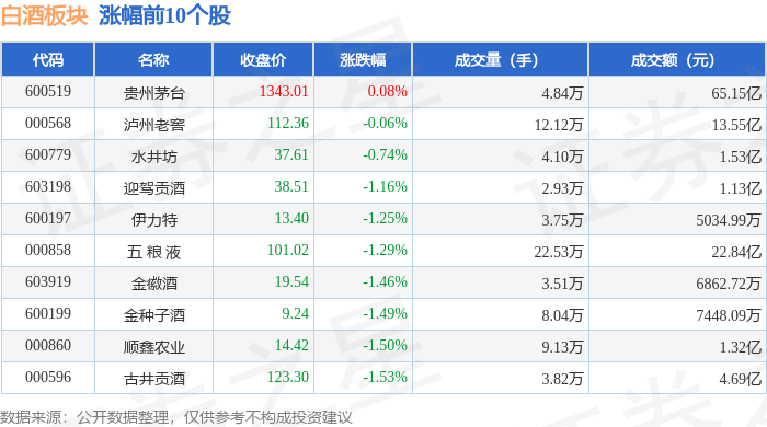 证券之星消息,1月27日白酒板块较上一交易日下跌0.56%,*ST岩石领跌。当日上证指数报收于4139.9,上涨0.18%。深证成指报收于14329.91, 上涨0.09%。白酒板块个股涨跌见下表: | 代码 | 名称 | 收盘价 | 涨跌幅 | 成交量(手) | 成交额(元) | | | --- | --- | --- | --- | --- | --- | --- | | 600519 | 贵州茅台 | 1343.01 | 0.08% | 4.84万 | | 65.15亿 | | 000568 | 泸州老窖 | 112.36 | -0.06% | 12.12万 | | 13.55亿 | | 600779 | 水井坊 | 37.61 | -0.74% | 4.10万 | | 1.53亿 | | 603198 | 迎驾贡酒 | 38.51 | -1.16% | 2.93万 | | 1.13亿 | | 600197 | 伊力特 | 13.40 | -1.25% | 3.75万 | | 5034.99万 | | 000858 | 五粮液 | 101.02 | -1.29% | 22.53万 | | 22.84亿 ...
