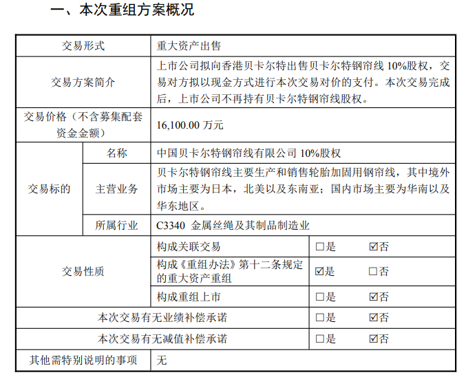 法尔胜拟出售贝卡尔特钢帘线10%股权 构成重大资产重组