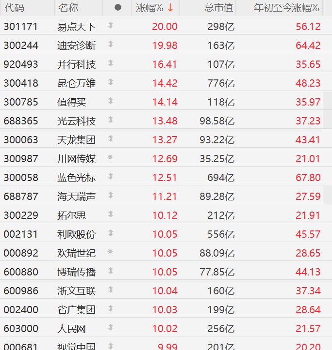 股票频道更多独家策划、专家专栏,免费查阅>> | 代码 | 名称 | | 涨幅% ↓ | 总市值 | 年初至今涨幅% | | --- | --- | --- | --- | --- | --- | | 301171 | 易点天下 | 1 | 20.00 | 298亿 | 56.12 | | 300244 | 迪安诊断 | 1 | 19.98 | 163亿 | 64.42 | | 920493 | 并行科技 | 1 | 16.41 | 107亿 | 35.65 | | 300418 | 昆仑万维 | 1 | 14.42 | 776亿 | 48.23 | | 300785 | 個得买 | 1 | 14.14 | 118亿 | 35.97 | | 688365 | 光云科技 | 1 | 13.48 | 98.58 Z | 37.23 | | 300063 | 天龙集团 | 1 | 13.27 | 93.22 Z | 43.41 | | 300987 | 川网传媒 | 被 | 12.69 | 35.25 乙 | 21.01 | | 300058 | 蓝色光标 | 1 | 12.51 | 694亿 | 67.80 | ...