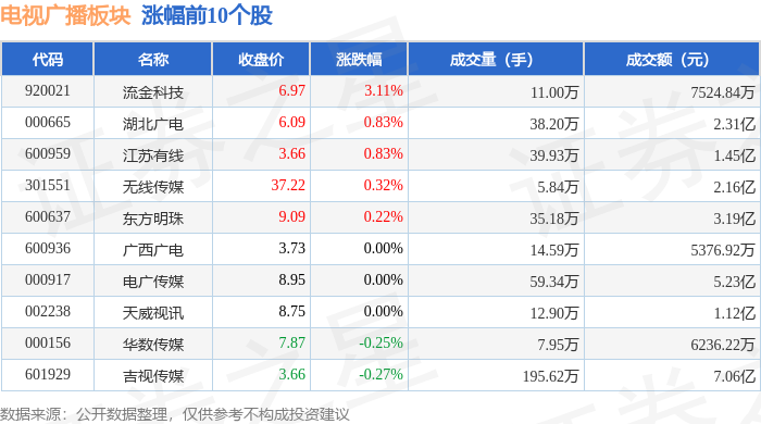 从资金流向上来看,当日电视广播板块主力资金净流出1.21亿元,游资资金净流出1737.26万元,散户资 金净流入1.38亿元。电视广播板块个股资金流向见下表: | 代码 | 名称 | 收盘价 | 涨跌幅 | 成交量(手) | 成交额(元) | | --- | --- | --- | --- | --- | --- | | 600831 | ST广网 | 4.84 | -3.20% | 15.58万 | 7567.58万 | | 301262 | 海量股份 | 25.01 | -1.30% | 9.94万 | 2.48亿 | | 600037 | 歌华有线 | 7.85 | -1.01% | 14.17万 | 1.11亿 | | 600996 | 贵广网络 | 9.58 | -0.73% | 18.49万 | 1.78亿 | | 300770 | 新媒股份 | 48.15 | -0.48% | 7.06万 | 3.37亿 | | 656109 | 吉视传媒 | 3.66 | -0.27% | 195.62万 | 7.06亿 | | 000156 | 华数传媒 | 7.87 | -0.25% | 7.95万 |  ...