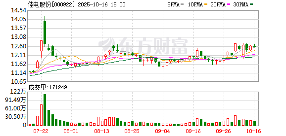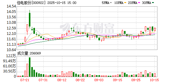 10月22日,佳电股份盘中上涨2.06%,截至13:10,报12.87元/股,成交1.90亿元,换手率2.57%,总市值 89.44亿元。 资金流向方面,主力资金净流出966.35万元,特大单买入1124.82万元,占比5.91%,卖出3404.46万元, 占比17.88%;大单买入4409.37万元,占比23.16%,卖出3096.08万元,占比16.26%。 佳电股份今年以来股价涨15.13%,近5个交易日涨2.14%,近20日涨7.34%,近60日跌0.23%。 资料显示,哈尔滨电气集团佳木斯电机股份有限公司位于黑龙江省佳木斯市前进区长安路247号,成立 日期1996年12月31日,上市日期1999年6月18日,公司主营业务涉及电机、屏蔽电机电泵制造与维修;电 机、防爆电气技术开发、技术服务。主营业务收入构成为:电动机100.00%。 佳电股份所属申万行业为:电力设备-电机Ⅱ-电机Ⅲ。所属概念板块包括:核电、磁悬浮、海上风电、 风能、央企改革等。 截至10月10日,佳电股份股东户数3.76万,较上期增加0.35%;人均流通股15614股,较上期减少 0.35%。2025年1月-6月,佳电股份实现营业收入 ...