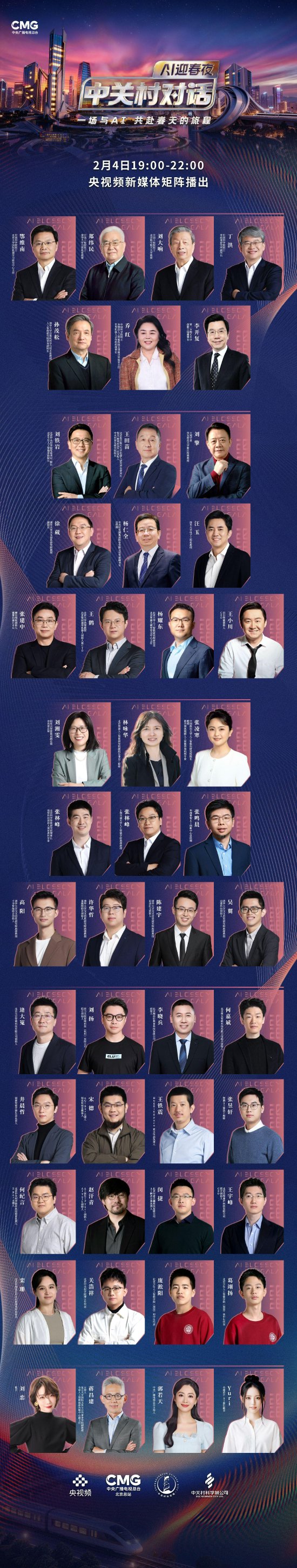 超强阵容集结完毕!今天19:00-22:00,锁定央视频新媒体矩阵,来《中关村对话·AI迎春夜》,与学 术泰斗、企业领袖、青年开发者、转型先锋、跨代用户,踏上一场与AI共赴春天的旅程。 A 山春夜 F 场与AI 2 3 3 ---------- 2月4日19:00-22:00 央视频新媒体矩阵播出 野佳用 第 HIST as 酸 樓 张桥峰 家 吗 日 anala Relation Production Production College College College College College College College College College Corporation Comment Comment 陈建宁 炸师哲 只 法 大 提 大 更 下 。 。 同點疑 澳 李晓兵 作出版社會出版社 ## 200 Son 生育| 洋血糖果 th 提 有 用 张昱轩 A 上張護 官网站上 起开育 网 # 时纪过 责任编辑:梁斌 SF055 超强阵容集结完毕!今天19:00-22:00,锁定央视频新媒体矩阵,来《中关村对话·AI迎春夜》,与学 术泰斗、企业领袖、青年开发者、转型先锋、跨代用户,踏上一场与 ...