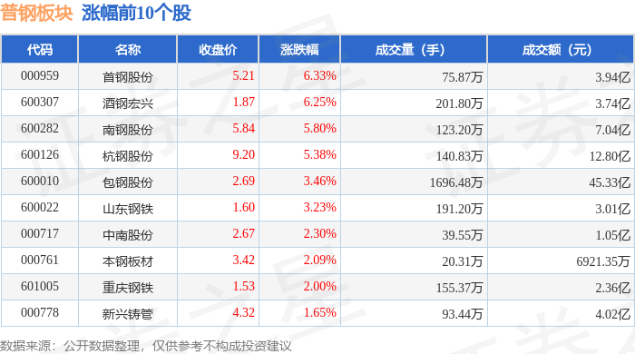 证券之星消息,1月12日普钢板块较上一交易日上涨2.24%,首钢股份领涨。当日上证指数报收于 4165.29,上涨1.09%。深证成指报收于14366.91,上涨1.75%。普钢板块个股涨跌见下表: | 代码 | 名称 | 收盘价 | 涨跌幅 | 成交量(手) | 成交额(元) | | | --- | --- | --- | --- | --- | --- | --- | | 6560000 | 首钢股份 | 5.21 | 6.33% | 75.87万 | | 3.94Z | | 600307 | 酒钢宏兴 | 1.87 | 6.25% | 201.80万 | | 3.74Z | | 600282 | 南钢股份 | 5.84 | 5.80% | 123.20万 | | 7.04亿 | | 600126 | 杭钢股份 | 9.20 | 5.38% | 140.83万 | | 12.80亿 | | 600010 | 包钢股份 | 2.69 | 3.46% | 1696.48万 | | 45.33 乙 | | 600022 | 山东钢铁 | 1.60 | 3.23% | 191.20万 | | 3.01亿 | | ...