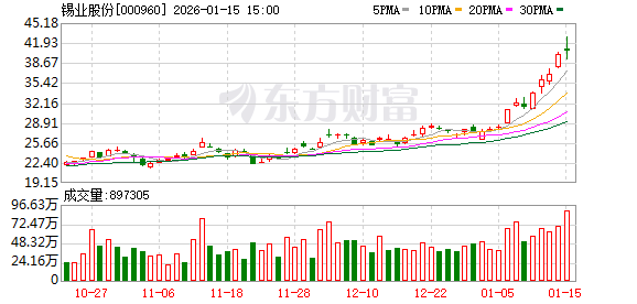 Core Viewpoint - Yunnan Tin Company has experienced significant stock price increases, with a year-to-date rise of 49.50% and a 32.87% increase over the past five trading days, indicating strong market performance and investor interest [2]. Group 1: Stock Performance - As of January 15, Yunnan Tin's stock price reached 41.68 yuan per share, with a trading volume of 5.82 billion yuan and a market capitalization of 685.97 billion yuan [1]. - The stock has shown remarkable growth over various time frames: 49.50% year-to-date, 32.87% in the last five trading days, 64.94% in the last 20 days, and 84.18% in the last 60 days [2]. Group 2: Financial Performance - For the period from January to September 2025, Yunnan Tin reported a revenue of 34.417 billion yuan, reflecting a year-on-year growth of 17.81%, and a net profit attributable to shareholders of 1.745 billion yuan, which is a 35.99% increase compared to the previous year [2]. - The company has distributed a total of 2.15 billion yuan in dividends since its A-share listing, with 1.103 billion yuan distributed over the last three years [3]. Group 3: Shareholder Information - As of September 30, 2025, Yunnan Tin had 84,100 shareholders, an increase of 5.00% from the previous period, with an average of 19,576 circulating shares per shareholder, a decrease of 4.76% [2]. - Notable changes in institutional holdings include Hong Kong Central Clearing Limited as the third-largest shareholder, increasing its stake by 6.8983 million shares, and several new entrants among the top ten shareholders [3].