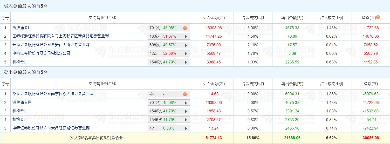 | 序号 | 交易营业部名称 | | | 买入金额(万) | 占总成交比例 | | --- | --- | --- | --- | --- | --- | | 1 | 深股通专用 | 701次 45.08% | 2 | 16398.06 | 5.00% | | 2 | 国泰海通证券股份有限公司上海静安区新闻路证券营业部 | 183次 51.37% | ▲ | 14747.25 | 4.50% | | 3 | 开源证券股份有限公司西安西大街证券营业部 | 698次 49.57% | ▶ | 7076.09 | 2.16% | | 4 | 中泰证券股份有限公司湖北分公司 | 42次 52.38% | ▲ | 5569.47 | 1.70% | | 5 | 机构专用 | 1546次 41.79% | ▲ | 3388.45 | 1.03% | | | 卖出金额最大的前5名 | | | | | | 序号 | 交易营业部名称 | | | 买入金额(万) | 占总成交比例 | 安泰科技(000969.SZ)今日涨停,换手率15.69%,成交额32.78亿元。龙虎榜数据显示,深股通买入1.64亿元,卖出4675万元,净买入 ...