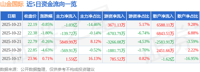 股票行情快报:山金国际(000975)10月23日主力资金净卖出1.03亿元