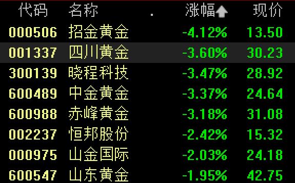| 代码 | 名称 | 涨幅◆ | 现价 | | --- | --- | --- | --- | | 000506 | 招金黄金 | -4.12% | 13.50 | | 001337 | 四川黄金 | -3.60% | 30.23 | | 300139 | 晓程科技 | -3.47% | 28.92 | | 600489 | 中金黄金 | -3.37% | 24.64 | | 886009 | 赤峰黄金 | -3.18% | 31.08 | | 002237 恒邦股份 | | -2.42% | 15.32 | | 000975 山金国际 | | -2.03% | 24.18 | | 600547 山东黄金 | | -1.95% | 42.75 | 10月14日午后,黄金股全线回落, 紫金矿业 跌超5%,早盘股价一度创历史新高。 招金黄金跌超4%, 中金黄金 、山东黄金 、 赤峰黄金 、 四川黄金 等集体下挫。 ...