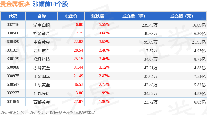 | 贵金属板块 涨幅前10个股 | | --- | | 代码 | 名称 | 收盘价 | 涨跌幅 | 成交量(手) | 成交额(元) | | | --- | --- | --- | --- | --- | --- | --- | | 002155 | 湖南黄金 | 22.57 | 1.90% | 89.04万 | | 20.06亿 | | 002716 | 湖南自银 | 6.48 | 0.78% | 142.62万 | | 9.31亿 | | 001337 | 四川黄金 | 27.69 | 0.33% | 13.88万 | | 3.87亿 | | 002237 | 恒邦股份 | 13.77 | 0.22% | 31.60万 | | 4.36亿 | | 300139 | 晓程科技 | 25.07 | 0.12% | 39.47万 | | 10.04亿 | | 600489 | 中令黄金 | 21.41 | -0.28% | 82.10万 | | 17.74亿 | | 601069 | 西部黄金 | 27.75 | -0.50% | 27.15万 | | 7.64亿 | | 600547 | 山东黄金 | 36.1 ...