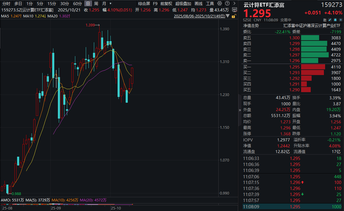 招商证券指出,海外科技企业持续加大AI领域创新。Oracle在资本市场日就人工智能基础设施项目的毛利率及最新订单情况、公司长期财务目标给出了更为 清晰的指引更新,进一步加深市场信心,目前公司RPO超过5000亿美元。除Oracle外,OpenAI与博通计划于2026年推出定制数据中心芯片,部署10GW的 OpenAI设计的AI加速器。此外,英伟达正式发布基于GB10 Grace Blackwell超级芯片的DGX Spark桌面AI超算。 今日(10.21),算力板块再度反攻,云计算ETF汇添富(159273)大涨超4%,盘中成交额快速逼近6000万元,已远超昨日全天!截至10月20日,最新规模 近16亿元,同类持续领先! | 分时 多日 1分 5分 15分 30分 60分 日 周 月 元 综合屏 F9 前复权 超级叠加 画线 工具 © 2 | > | 云计算ETF汇添富 | | 15 | | --- | --- | --- | --- | --- | | 159273.SZI云计算ETF汇添富I 2025/10/21 收 1.295 幅 4.10%(0.051) 开 1.256 高 1.296 低 1.24 ...
