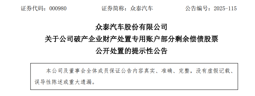 12月17日晚间,众泰汽车(000980)公告,计划于公司破产企业财产处置专用账户(以下简称"处置专户")解除司法冻结之 日(即2025年12月9日)起的三个月内通过集中竞价方式、大宗交易方式处置股份合计不超过公司股份总数的3%,即不超过 1.51亿股。 公告显示,众泰汽车计划通过集中竞价交易处置股份的总数不超过公司股份总数的1%,通过大宗交易方式处置股份的总数不 超过公司股份总数的2%。按12月18日众泰汽车最新收盘价3.77元/股测算,公司计划处置1.51亿股股份市值约为5.6亿元。 记者注意到,众泰汽车此次在公告中表示,处置所得计划用于偿还历史遗留债务。而此前,众泰汽车曾多次公开披露,该项 处置资金将用于复工复产工作。 据众泰汽车12月9日晚间公告,公司收到深圳市罗湖区人民法院民事裁定书,处置专户所持本公司全部3.35亿股股票已经深圳 市罗湖区人民法院裁定解除司法冻结。众泰汽车称,公司计划在解除司法冻结后的三个月内,通过集中竞价方式、大宗交易 方式处置股份合计不超过公司股份总数的3%,即不超过1.51亿股。众泰汽车在公告中强调,处置上述股票所获得的经营性流 动资金,将全额增加公司净资产,并用于支持整车板 ...