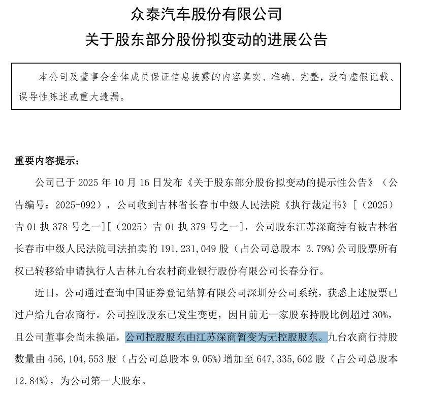 10月22日,众泰汽车(000980)发布公告,公司收到吉林省长春市中级人民法院的执行裁定书,江苏深商控股集团有 限公司持有的1.91亿股公司股票所有权已转移给申请执行人九台农商行,这部分股份占公司总股本的3.79%。 近日,公司通过查询中国证券登记结算有限公司深圳分公司系统,获悉上述股票已过户给九台农商行。公司控股股东 已发生变更,因目前无一家股东持股比例超过30%,且公司董事会尚未换届,公司控股股东由江苏深商暂变为无控股 股东。 目前,九台农商行持股数量由456104553股,(占公司总股本9.05%)增加至647335602股(占公司总股本12.84%),为 公司第一大股东。 据悉,本次转移的1.91亿股票是通过吉林省长春市中级人民法院司法拍卖,所有权转移给申请执行人九台农商行。 众泰汽车披露的公告显示,今年8月以来, 公司控股股东及其一致行动人持有的公司股票中合计共有786,290,927股 (占总股本15.59%)的公司股份被司法拍卖,并已全部划扣给相关权利人。 截至2025年半年报披露,2025年上半年,江苏深商控股集团有限公司、深圳市国民数字信息技术有限公司、吉林众富 同人投资中心 (有限合伙) ...