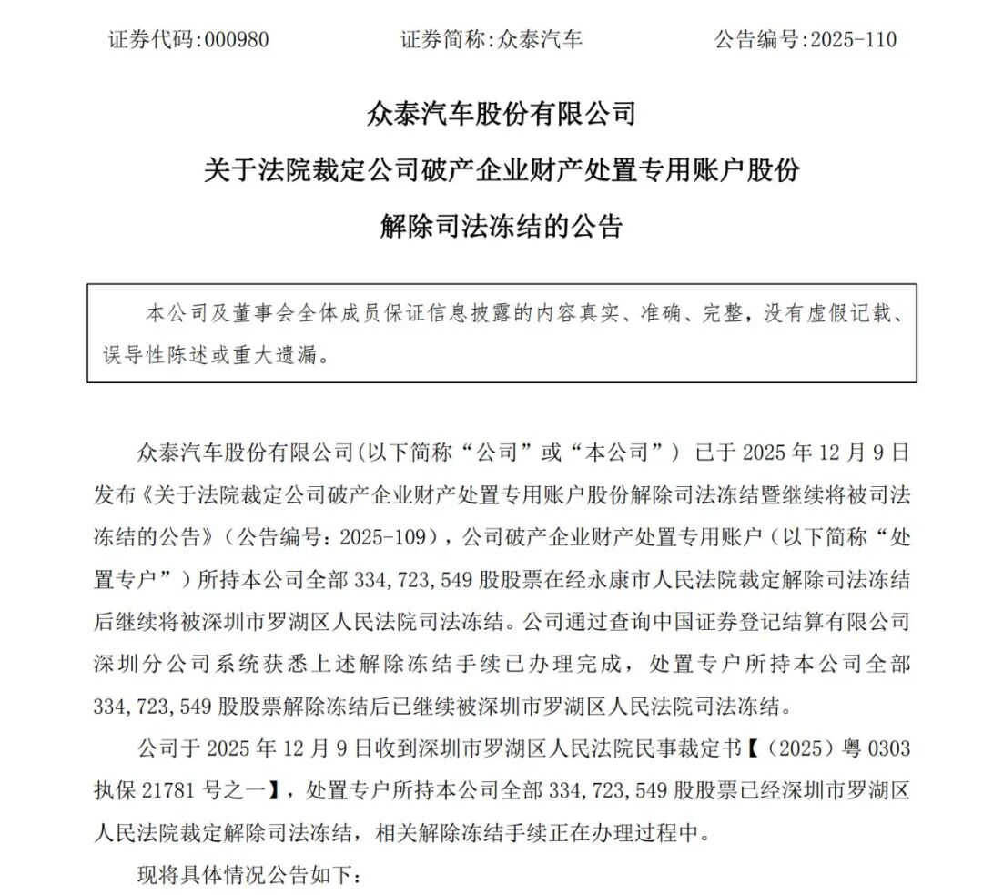 证券代码:000980 证券简称:众泰汽车 公告编号:2025-110 众泰汽车股份有限公司 关于法院裁定公司破产企业财产处置专用账户股份 解除司法冻结的公告 本公司及董事会全体成员保证信息披露的内容真实、准确、完整,没有虚假记载、 误导性陈述或重大遗漏。 众泰汽车股份有限公司(以下简称"公司"或"本公司") 已于 2025 年 12 月 9 日 发布《关于法院裁定公司破产企业财产处置专用账户股份解除司法冻结暨继续将被司法 冻结的公告》(公告编号:2025-109),公司破产企业财产处置专用账户(以下简称"处 置专户")所持本公司全部 334,723,549 股股票在经永康市人民法院裁定解除司法冻结 后继续将被深圳市罗湖区人民法院司法冻结。公司通过查询中国证券登记结算有限公司 深圳分公司系统获悉上述解除冻结手续已办理完成,处置专户所持本公司全部 334,723,549 股股票解除冻结后已继续被深圳市罗湖区人民法院司法冻结。 公司于 2025 年 12 月 9 日收到深圳市罗湖区人民法院民事裁定书【(2025)粤 0303 执保 21781 号之一】,处置专户所持本公司全部 334,723,549 股股票已经深 ...