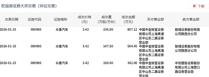 Group 1 - On January 15, 2026, Zhongtai Automobile executed a block trade of 4.835 million shares, with a total transaction value of 16.5357 million yuan, accounting for 5.39% of the total trading volume for that day [1] - The transaction price was 3.42 yuan per share, which remained stable compared to the market closing price of 3.42 yuan [1] - The trading involved multiple transactions, with significant volumes including 236,000 shares and 147,500 shares, primarily facilitated by China International Capital Corporation and other brokerage firms [2]