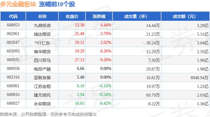 证券之星消息,1月27日多元金融板块较上一交易日下跌1.45%,越秀资本领跌。当日上证指数报收于 4139.9,上涨0.18%。深证成指报收于14329.91,上涨0.09%。多元金融板块个股涨跌见下表: | 代码 | 名称 | 主力净流入(元) | 主力净占比 游资净流入(元) | | 游资净占比 散户净流入 (元) | | 散户净占比 | | --- | --- | --- | --- | --- | --- | --- | --- | | 002961 | 瑞达期货 | 3080.84万 | 5.81% | -714.56万 | -1.35% | -2366.27万 | -4.46% | | 600053 | 九鼎投资 | 1888.21万 | 5.74% | -460.64万 | -1.40% | -1427.56万 | -4.34% | | 000935 四川双马 | | 1049.03万 | 5.35% | 519.78万 | 2.65% | -1568.81万 | -8.01% | | 603093 | 南华期货 | 546.38万 | 2.33% | 299.24万 | 1.27% | -84 ...