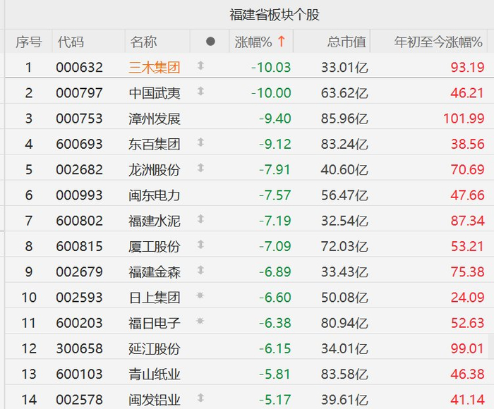 Core Points - The Fujian stock market experienced a collective decline, with several companies hitting their daily limit down, indicating a significant downturn in investor sentiment [1] - Notable companies that faced steep declines include Sanmu Group and China Wuyi, both of which hit the daily limit down, while others like Zhangzhou Development and Dongbai Group approached limit down [1] - The previously rising stocks, Haixia Innovation and Pingtan Development, announced a suspension of trading for verification due to severe price deviations from their fundamentals [1] Company Performance - Sanmu Group: Down 10.03%, market cap at 3.301 billion, YTD increase of 93.19% [2] - China Wuyi: Down 10.00%, market cap at 6.362 billion, YTD increase of 46.21% [2] - Zhangzhou Development: Down 9.40%, market cap at 8.596 billion, YTD increase of 101.99% [2] - Dongbai Group: Down 9.12%, market cap at 8.324 billion, YTD increase of 38.56% [2] - Longzhou Co.: Down 7.91%, market cap at 4.060 billion, YTD increase of 70.69% [2] - Mindong Electric Power: Down 7.57%, market cap at 5.647 billion, YTD increase of 47.66% [2] - Fujian Cement: Down 7.19%, market cap at 3.254 billion, YTD increase of 87.34% [2] - XGMA: Down 7.09%, market cap at 7.203 billion, YTD increase of 53.21% [2] - Fujian Jinsen: Down 6.89%, market cap at 3.343 billion, YTD increase of 75.38% [2] - Rishang Group: Down 6.60%, market cap at 5.008 billion, YTD increase of 24.09% [2] - Furi Electronics: Down 6.38%, market cap at 8.094 billion, YTD increase of 52.63% [2] - Yanjian Co.: Down 6.15%, market cap at 3.401 billion, YTD increase of 99.01% [2] - Huangshi Zhan: Down 5.81%, market cap at 8.358 billion, YTD increase of 46.38% [2] - Minfa Aluminum: Down 5.17%, market cap at 3.961 billion, YTD increase of 41.14% [2]