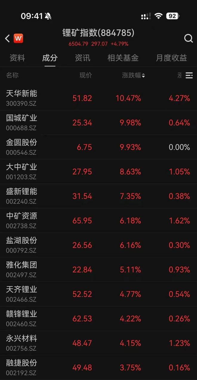 | 09:41 % | | | 126 8 110 | | --- | --- | --- | --- | | < W | 锂矿指数(884785) | | | | | 6504.79 297.07 +4.79% | | Q | | *** 成分 | 资讯 | 相关基金 | 月度收益 | | 名称 | 现价 | 涨跌幅 ◆ | 门 买 | | 天华新能 | 51.82 | 10.47% | 4.27% | | 300390.SZ | | | | | 国城矿业 | 25.34 | 9.98% | 0.64% | | 000688.SZ | | | | | 金圆股份 | 6.75 | 9.93% | 0.00% | | 000546.SZ | | | | | 大中矿业 | 27.95 | 8.63% | 1.05% | | 001203.SZ | | | | | 盛新锂能 | 31.54 | 7.35% | 0.38% | | 002240.SZ | | | | | 中矿资源 | 65.95 | 6.18% | 1.62% | | 002738.SZ | | | | | 盐湖股份 | 26.56 | 6.16% ...