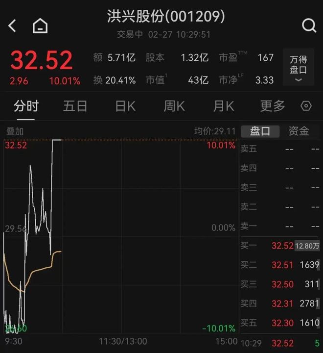 2月27日,洪兴股份盘中上演"地天板",走出3连板,成交额达5.71亿元,该股今早一度跳水触及跌停。 编辑|钉钉 | < 日 | | 洪兴股份(001209) | | | | | | --- | --- | --- | --- | --- | --- | --- | | | | 交易中 02-27 10:29:51 | | | | | | 32.52 | | 额 5.71亿 股本 1.32亿 市盈 | | | 167 | 万得 器■ | | 2.96 | 10.01% | 换 20.41% 市值 43亿 市净" | | | 3.33 | | | 分时 | 五日 | 日K 月K | 周K | | 申示 | | | 图加 | | 均价:29.11 | | 盘口 | | 答寺 | | 32.52 | | 10.01% | | | | | | | | 0.00% 买 | | | | | | | | | | | | 32.52 12.80万 | | | | | | | | 32.51 1639 | | | | | | | | 32.50 311 | | | | | | ST DU | | 32.31 2781 | | ...