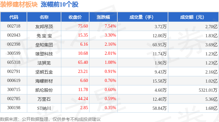 证券之星消息,1月23日装修建材板块较上一交易日上涨0.24%,鲁阳节能领涨。当日上证指数报收于 4136.16,上涨0.33%。深证成指报收于14439.66,上涨0.79%。装修建材板块个股涨跌见下表: | 代码 | 名称 | 收盘价 | 涨跌幅 | 成交量(手) | 成交额(元) | | | --- | --- | --- | --- | --- | --- | --- | | 002088 | 亀阳节能 | 12.87 | 10.00% | 19.80万 | | 2.47亿 | | 002718 | 友邦吊顶 | 67.38 | 6.99% | 3.07万 | | 2.00亿 | | 6118889 | 中钢洛耐 | 7.52 | 6.67% | 75.50万 | | 5.62亿 | | 920076 | 国亮新材 | 29.60 | 5.49% | 13.38万 | | 3.98亿 | | 002398 | 垒知隼团 | 6.41 | 5.08% | 85.08万 | | 5.44亿 | | 301010 | 晶雪节能 | 24.06 | 3.75% | 6.54万 | | 1.56亿 | | 00 ...