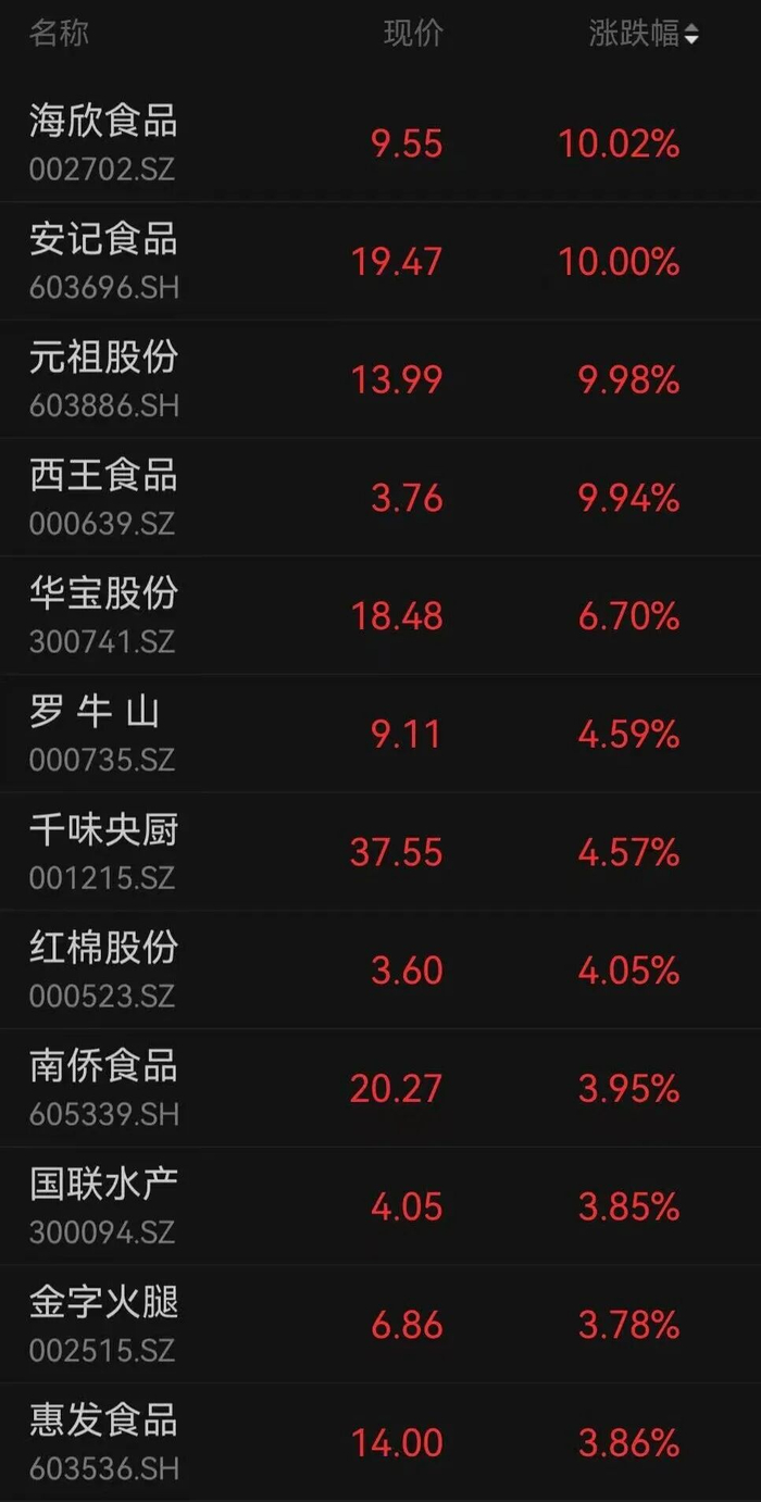 12月5日午后,大消费板块异动拉升,元祖股份直线涨停,此前海欣食品、安记食品已涨停,千味央 厨、红棉股份、金字火腿、惠发食品跟涨。 | 名称 | 现价 | 涨跌幅 ◆ | | --- | --- | --- | | 海欣食品 | 9.55 | 10.02% | | 002702.SZ | | | | 安记食品 | 19.47 | 10.00% | | 603696.SH | | | | 元祖殷份 | 13.99 | 9.98% | | 603886.SH | | | | 西王食品 | 3.76 | 9.94% | | 000639.SZ | | | | 华宝股份 | 18.48 | 6.70% | | 300741.SZ | | | | 罗牛山 | 9.11 | 4.59% | | 000735.SZ | | | | 千味央厨 | 37.55 | 4.57% | | 001215.SZ | | | | 红棉股份 | 3.60 | 4.05% | | 000523.SZ | | | | 南侨食品 | | | |钉钉 | 605339.SH | ZU.LI | 0.70% | | --- | --- | --- ...