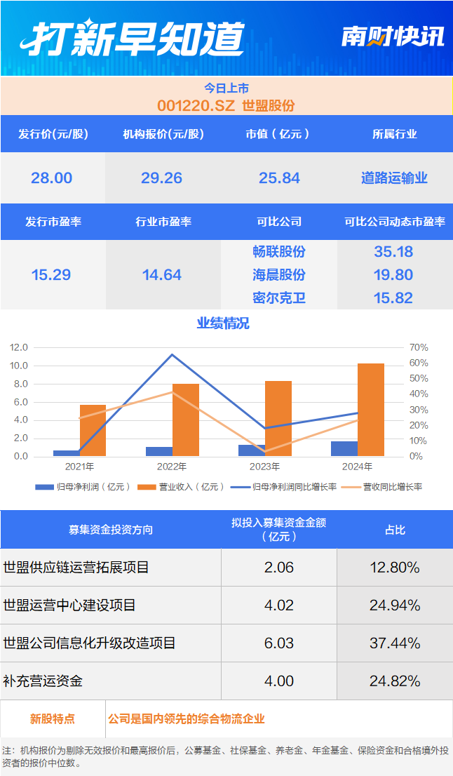 2月3日,有一只新股上市,为深市主板的世盟股份(001220.SZ)。该公司成立于2010年,主要专注于 为生产制造业企业提供包括供应链综合物流服务和干线运输服务在内的全方位、一体化供应链合同物流 服务。 | 打新早知道 | | | 南财快讯 | | --- | --- | --- | --- | | 今日上市 | | | | | 001220.SZ 世盟股份 | | | | | 发行价(元/股) | 机构报价(元/股) | 市值(亿元) | 所属行业 | | 28.00 | 29.26 | 25.84 | 道路运输业 | | 发行市盈率 | 行业市盈率 | 可以公司 | 可比公司动态市盈率 | | 15.29 | 14.64 | 畅联股份 | 35.18 | | 海晨股份 | | | 19.80 | | 密尔克卫 | | | 15.82 | | 业绩情况 | | | | | 12.0 | | | 70% | | 10.0 | | | 60% | | 8.0 | | | 50% | | 6.0 | | | 40% | | | | | 30% | | 4.0 | | | 20% | | 2.0 | | | 10 ...