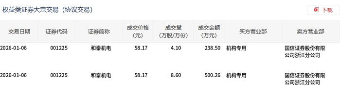 | 交易日期 | 证券代码 | 证券简称 | 成交价格 | 成交量 | 成交金额 | 买方营业部 | 卖方营业部 | | --- | --- | --- | --- | --- | --- | --- | --- | | | | | (元) | (万股/万份) | (万元) | | | | 2026-01-06 | 001225 | 和泰机电 | 58.17 | 4.10 | 238.50 机构专用 | | 国信证券股份有限 | | | | | | | | | 公司浙江分公司 | | 2026-01-06 | 001225 | 和泰机电 | 58.17 | 8.60 | 500.26 机构专用 | | 国信证券股份有限 | | | | | | | | | 公司浙江分公司 | 1月6日,和泰机电大宗交易成交12.7万股,成交额738.76万元,占当日总成交额的3.61%,成交价58.17 元,较市场收盘价69.18元折价15.92%。 ...