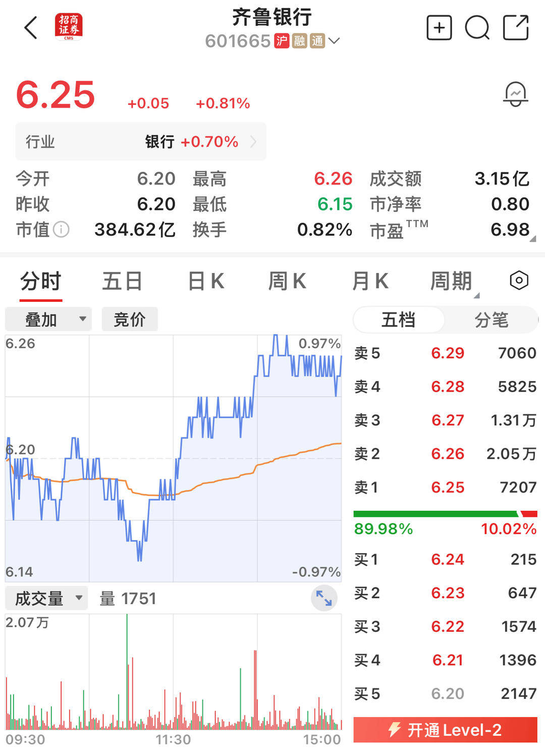 | 6.25 | +0.05 | +0.81% | | | | | | --- | --- | --- | --- | --- | --- | --- | | 行业 | | 银行 +0.70% | | | | | | 今开 | 6.20 | 最高 | 6.26 | 成交额 | | 3.15亿 | | 昨日 | 6.20 | 最低 | 6.15 | 市净率 | | 0.80 | | 市值1 | 384.62亿 | 换手 | 0.82% | 干皮 M | | 6.98 | | 分时 | 五日 | 日K | 間K | 月K | 周期 | 0 | | 叠加 | 竟价 | | | 五档 | | 分笔 | | 6.26 | | | 0.97% | 英5 | 6.29 | 706 | | | | | | 英4 | 6.28 | 582 | | | | | | 英3 | 6.27 | 1.317 | | | | | | 英2 | 6.26 | 2.057 | | | | | | 英1 | 6.25 | 720 | | | | | | 89.98% | | 10.029 | | 6.14 | | | -0.97% | 录1 | ...