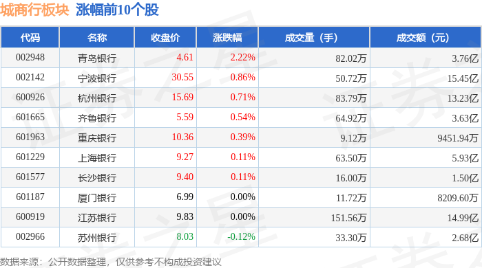 证券之星消息,1月27日城商行板块较上一交易日上涨0.13%,青岛银行领涨。当日上证指数报收于 4139.9,上涨0.18%。深证成指报收于14329.91,上涨0.09%。城商行板块个股涨跌见下表: | 代码 | 名称 | 收盘价 | 涨跌幅 | 成交量(手) | 成交额(元) | | --- | --- | --- | --- | --- | --- | | 002948 | 青岛银行 | 4.61 | 2.22% | 82.02万 | 3.76亿 | | 002142 | 宁波银行 | 30.55 | 0.86% | 50.72万 | 15.45 Z | | 600926 | 杭州银行 | 15.69 | 0.71% | 83.79万 | 13.23 乙 | | 601665 | 齐鲁银行 | 5.59 | 0.54% | 64.92万 | 3.63亿 | | 601963 | 重庆银行 | 10.36 | 0.39% | 9.12万 | 9451.94万 | | 601229 | 上海银行 | 9.27 | 0.11% | 63.50万 | 5.93亿 | | 601577 | 长沙银行 | 9.40 ...