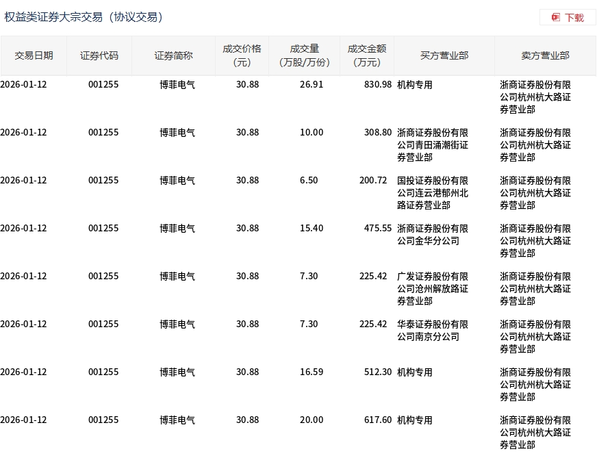 1月12日,博菲电气大宗交易成交110万股,成交额3396.79万元,占当日总成交额的15.18%,成交价30.88元,较市场收盘价 37.71元折价18.11%。 | 交易日期 | 证券代码 | 证券简称 | 成交价格 | 成交量 | 成交全额 买方营 部 | 卖方营业部 | | --- | --- | --- | --- | --- | --- | --- | | | | | (元) | (万股/万份) | (万元) | | | 2026-01-12 | 001255 | 博菲电气 | 30.88 | 26.91 | 830.98 机构专用 | 浙商证券股份有限 | | | | | | | | 公司杭州杭大路证 | | | | | | | | 券营业部 | | 2026-01-12 | 001255 | 博菲电气 | 30.88 | 10.00 | 308.80 浙商证券股份有限 | 浙商证券股份有限 | | | | | | | 公司青田涌潮街证 | 公司杭州杭大路证 | | | | | | | 券营业部 | 券营业部 | | 2026-01-12 | 001255 | 博菲电气 | 30.88 | 6. ...