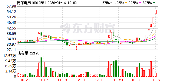 近日该股表现 | 日期 | 当日涨跌幅(%) | 换手率(%) | 主力资金净流入(万元) | | --- | --- | --- | --- | | 2026.01.15 | 9.99 | 7.22 | 7317.97 | | 2026.01.14 | 10.00 | 12.97 | 4174.22 | | 2026.01.13 | 10.00 | 6.35 | 10600.65 | | 2026.01.12 | 10.01 | 7.53 | 6481.83 | | 2026.01.09 | 0.06 | 5.56 | -276.41 | | 2026.01.08 | 0.47 | 7.25 | 223.41 | | 2026.01.07 | -4.80 | 11.77 | -1672.59 | | 2026.01.06 | 10.01 | 8.50 | 5749.54 | | 2026.01.05 | 1.65 | 3.29 | -132.53 | | 2025.12.31 | -0.40 | 2.60 | -282.50 | 博菲电气盘中涨停,已连收5个涨停板,截至9:33,该股报55.21元,换手率3 ...