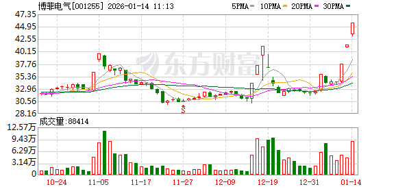 | 日期 | 当日涨跌幅(%) | 换手率(%) | 主力资金净流入(万元) | | --- | --- | --- | --- | | 2026.01.13 | 10.00 | 6.35 | 10600.65 | | 2026.01.12 | 10.01 | 7.53 | 6481.83 | | 2026.01.09 | 0.06 | 5.56 | -276.41 | | 2026.01.08 | 0.47 | 7.25 | 223.41 | | 2026.01.07 | -4.80 | 11.77 | -1672.59 | | 2026.01.06 | 10.01 | 8.50 | 5749.54 | | 2026.01.05 | 1.65 | 3.29 | -132.53 | | 2025.12.31 | -0.40 | 2.60 | -282.50 | | 2025.12.30 | -0.89 | 3.43 | -83.98 | | 2025.12.29 | -0.86 | 3.50 | -217.22 | (文章来源:证券时报网) 博菲电气盘中涨停,已连收3个涨停板,截至9:35,该股报45.63元 ...