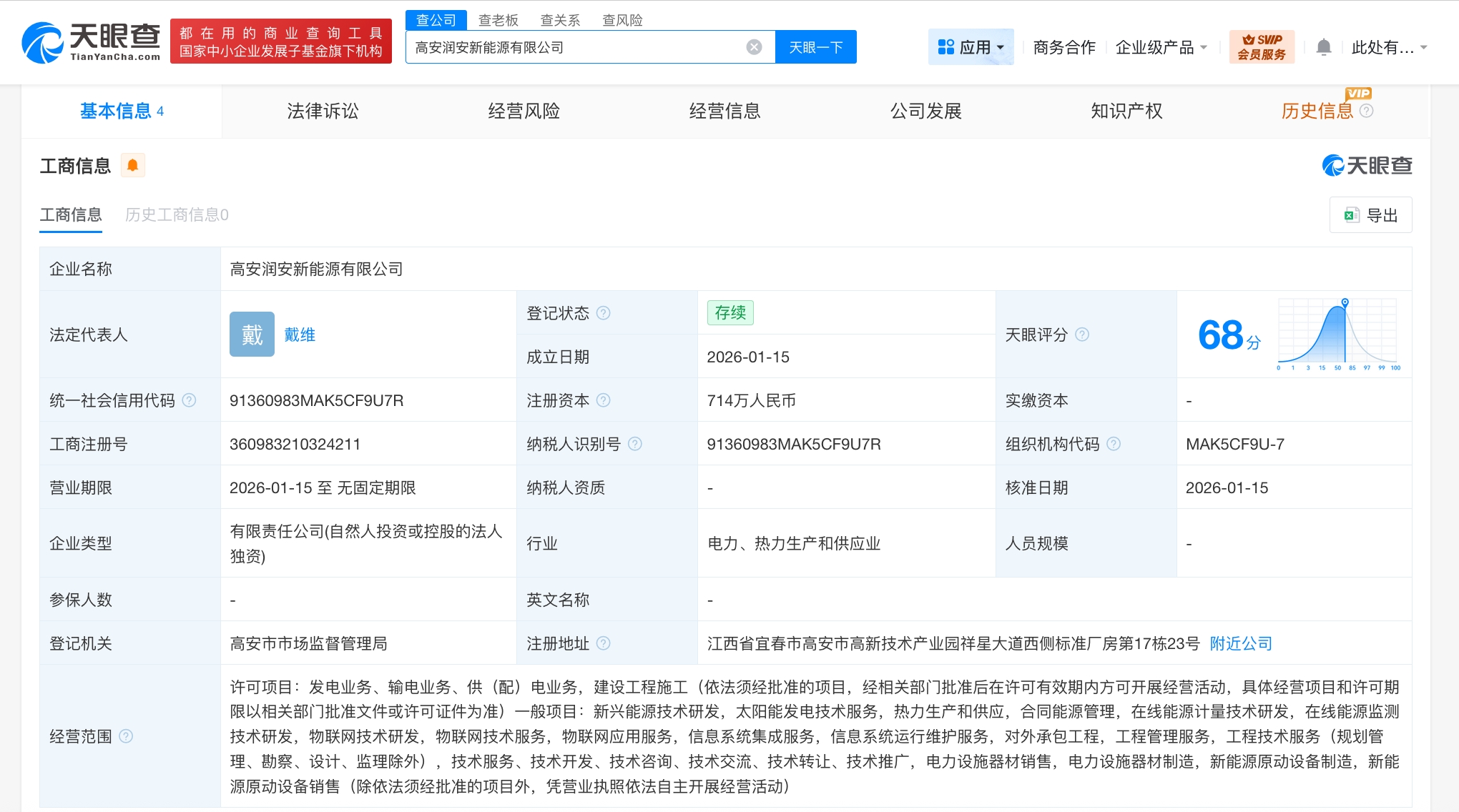 21财经1月15日电,天眼查工商信息显示,近日,高安润安新能源有限公司成立,法定代表人为戴维,注册资本714万人民币,经营范围含发电业务、输电业 务、供(配)电业务,建设工程施工,新兴能源技术研发,太阳能发电技术服务,热力生产和供应,物联网技术服务,信息系统集成服务等。股权全景穿透 图显示,该公司由时代绿色能源有限公司全资持股,后者为宁德时代(300750)全资子公司。 ▲ 高安润安新能源有限公司 亚洲专 股权结构全景 股权穿透图 (+) 宁德时代新能源科技股份有 限公司 高安润安新能源有限公司 经营信息 基本信息 4 法律诉讼 经营风险 工商信息 ● 工商信息 历史工商信息0 企业名称 高安润安新能源有限公司 登记状态 ② 存续 載 法定代表人 戴维 成立日期 2026-01-1! 统一社会信用代码 ② 91360983MAK5CF9U7R 注册资本 2 714万人民i 纳税人识别号 ② 工商注册号 360983210324211 91360983N 营业期限 2026-01-15 至 无固定期限 纳税人资质 有限责任公司(自然人投资或控股的法人 行业 企业类型 电力、热力 独资) 参保人数 英文名称 - ...