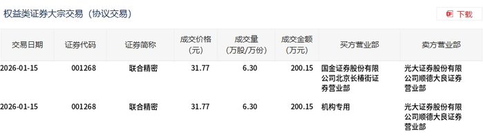 | 交易日期 | 证券代码 | 证券简称 | 成交价格 | 成交量 | 成交金额 | 买方营业部 | 卖方营业部 | | --- | --- | --- | --- | --- | --- | --- | --- | | | | | (元) | (万股/万份) | (万元) | | | | 2026-01-15 | 001268 | 联合精密 | 31.77 | 6.30 | | 200.15 国金证券股份有限 | 光大证券股份有限 | | | | | | | | 公司北京长椿街证 | 公司顺德大良证券 | | | | | | | 芽雪亚部 | | 营业部 | | 2026-01-15 | 001268 | 联合精密 | 31.77 | 6.30 | 200.15 机构专用 | | 光大证券股份有限 | | | | | | | | | 公司顺德大良证券 | | | | | | | | | 营补题 | 1月15日,联合精密大宗交易成交12.6万股,成交额400.3万元,占当日总成交额的4.13%,成交价31.77 元,较市场收盘价35.93元折价11.58%。 ...