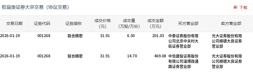 | 交易日期 | 证券代码 | 证券简称 | 成交价格 | 成交量 | 成交全额 | 买方营业部 | 卖方营业部 | | --- | --- | --- | --- | --- | --- | --- | --- | | | | | (元) | (万股/万份) | (万元) | | | | 2026-01-19 | 001268 | 联合精密 | 31.91 | 6.30 | 201.03 | 中泰证券股份有限 | 光大证券股份有限 | | | | | | | | 公司北京中关村大 | 公司顺德大良证券 | | | | | | | | 街证券营业部 | 营业部 | | 2026-01-19 | 001268 | 联合精密 | 31.91 | 14.70 | | 469.08 中信建投证券股份 | 光大证券股份有限 | | | | | | | | 有限公司淄博政通 | 公司顺德大良证券 | | | | | | | | 路证券营业部 | 营业部 | 1月19日,联合精密大宗交易成交21万股,成交额670.11万元,占当日总成交额的3.91%,成交价31.91元,较市场收盘价 36.48元折价12.53%。 ...