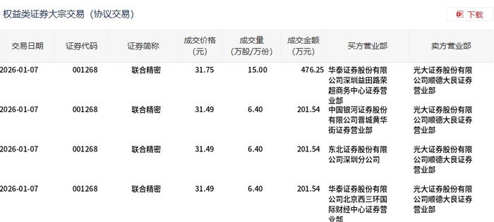 1月7日,联合精密大宗交易成交34.2万股,成交额1080.87万元,占当日总成交额的10.85%,成交均价 31.6元,较市场收盘价35.28元折价10.42%,其中最高成交价31.75元,最低成交价31.49元。 | 交易日期 | 证券代码 | 证券简称 | 成交价格 | 成交量 | 成交舍额 | 买方营业部 | 卖方营业部 | | --- | --- | --- | --- | --- | --- | --- | --- | | | | | (元) | (万股/万份) | (万元) | | | | 2026-01-07 | 001268 | 联合精密 | 31.75 | 15.00 | | 476.25 华泰证券股份有限 | 光大证券股份有限 | | | | | | | | 公司深圳益田路荣 | 公司顺德大良证券 | | | | | | | | 超商务中心证券营 | 营业部 | | | | | | | | 业部 | | | 2026-01-07 | 001268 | 联合精密 | 31.49 | 6.40 | | 201.54 中国银河证券股份 | 光大证券股份有限 | | | | | | | | 有限 ...