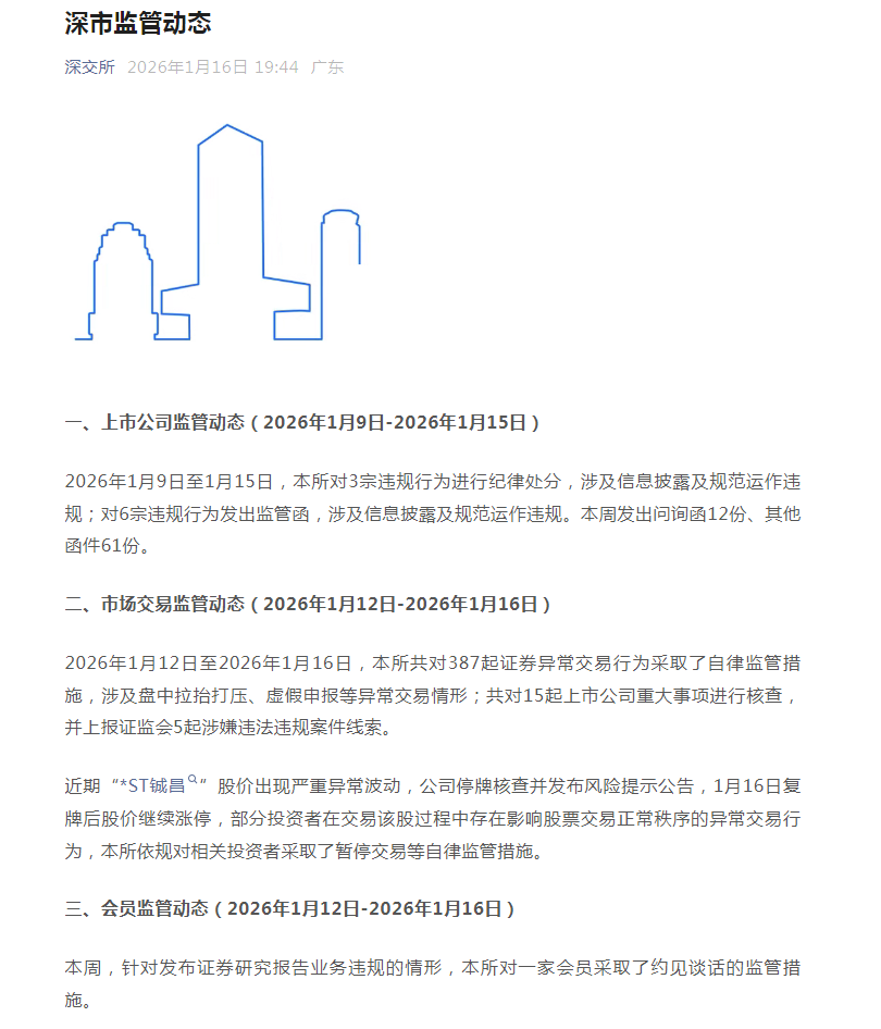Core Viewpoint - The A-share market has experienced a significant cooling after a month of rapid growth, influenced by regulatory measures aimed at enhancing market stability and preventing excessive speculation [1] Regulatory Measures - The China Securities Regulatory Commission (CSRC) emphasized the need for comprehensive market monitoring and timely counter-cyclical adjustments to maintain market stability [1] - The CSRC plans to strengthen trading and information disclosure regulations, focusing on preventing market manipulation and excessive speculation [3] Margin Requirement Adjustments - The minimum margin requirement for financing purchases has been raised from 80% to 100% for new financing contracts, marking the first increase in 10 years as the market approaches a critical index level [2] - This adjustment is part of a broader strategy to implement counter-cyclical regulation in the financing and securities market [2] Increased Regulatory Actions - The Shanghai Stock Exchange (SSE) reported taking self-regulatory measures against 365 instances of abnormal trading behavior in a single week, indicating a significant increase in regulatory scrutiny [4] - The Shenzhen Stock Exchange (SZSE) also intensified its regulatory actions, addressing 387 cases of abnormal trading behavior during the same period [5] Historical Context - The increase in regulatory measures follows a period of rapid market growth that began in mid-December 2025, with a notable rise in the number of abnormal trading cases being addressed by both exchanges [5]